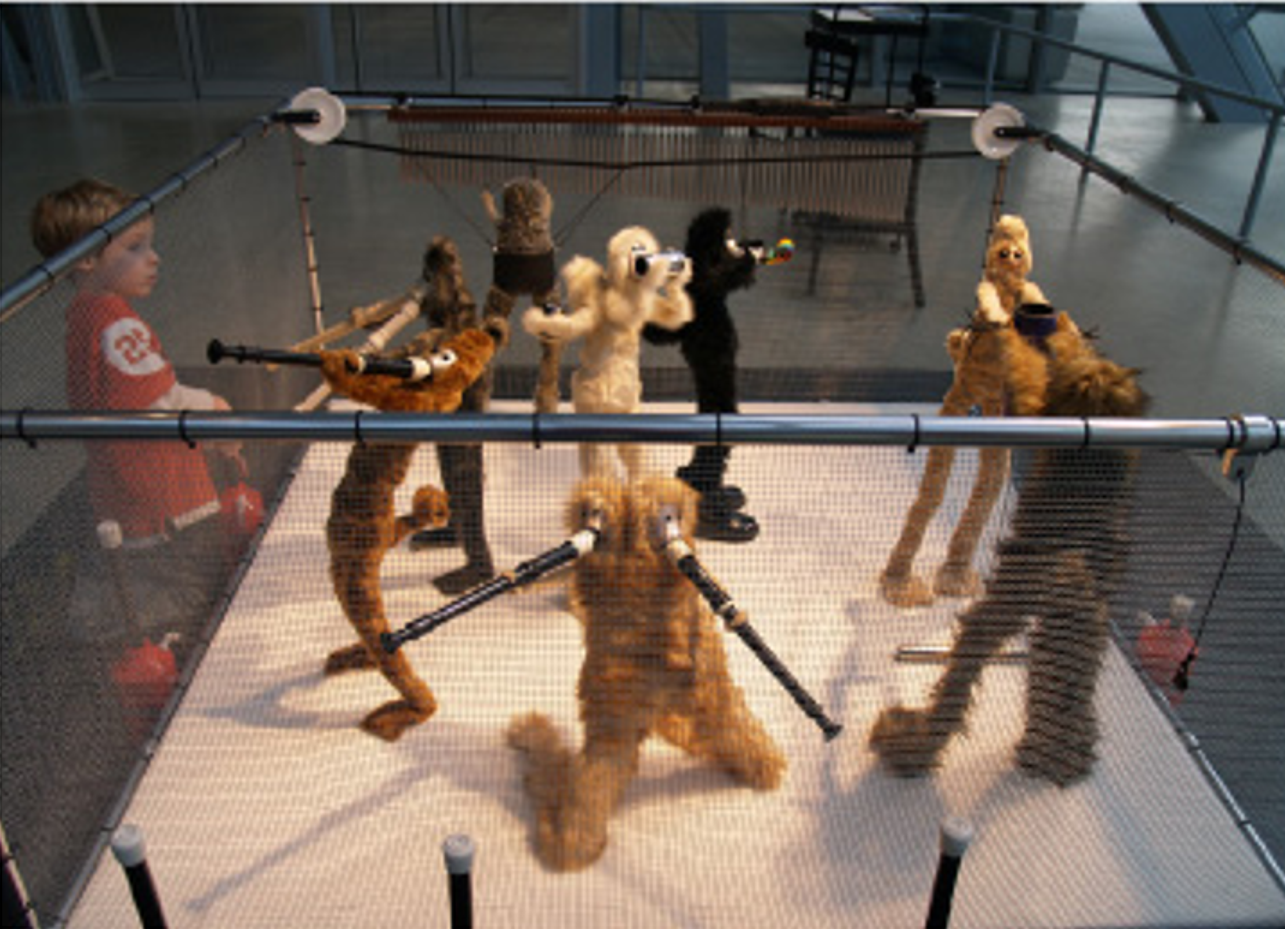 Baby New Year Jam! was created for First Night Akron, an annual family friendly New Years Eve celebration in downtown Akron. This interactive, kinetic, sound sculpture was inspired by people of all ages coming together to celebrate the NEW. In Baby New Year Jam! visitors create music together by manipulating a series Of mechanical systems that control a litter of 13 babies playing recorders, bar chimes, a bird whistle, foghorn and thunder tube!