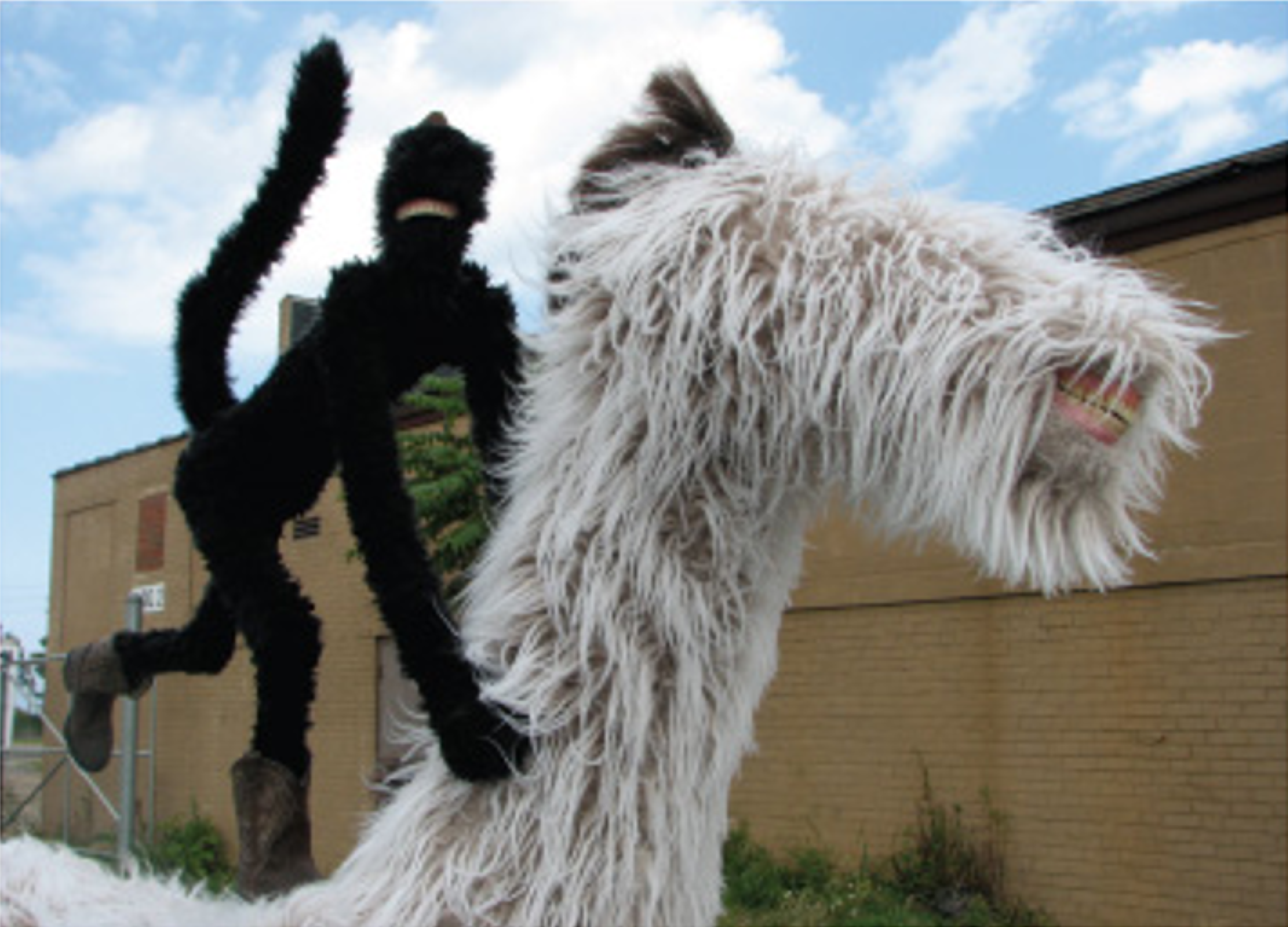 As a featured artist at the Ingenuity Festival of Art and Technology, I created Urban Trotter, a kinetic, interactive sculpture resembling a life-size walking horse and rider. The rider, a monkey wearing cowboy boots and bearing false teeth stands on top of the horse. Festival-goers are needed to make the sculpture come alive. With help of an articulated steering system, visitors push the piece, navigating horse and rider throughout festival grounds. The horse's legs, rigged atop cams, simulate walking, while head and tail bob up and down. As Urban Trotter travels down alleys and around city corners, horse-related audio sounds play and are transmitted to wireless speakers along the course, creating "audio/visual events" for bystanders as the horse rolls by.