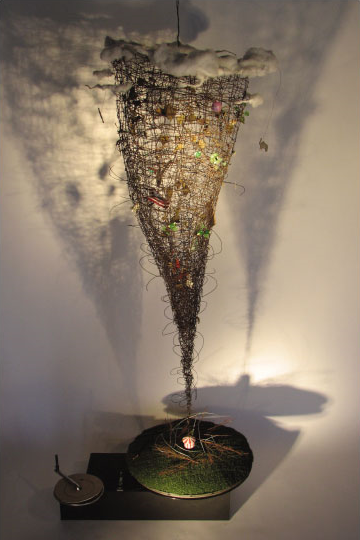 The Tornado was created after finding a roll of old fencing when I was walking my dog one day. The coil of rusty wire was already packed with yard debris perfect for a tornado, so I hooked it up to Milo and he dragged the roll home.